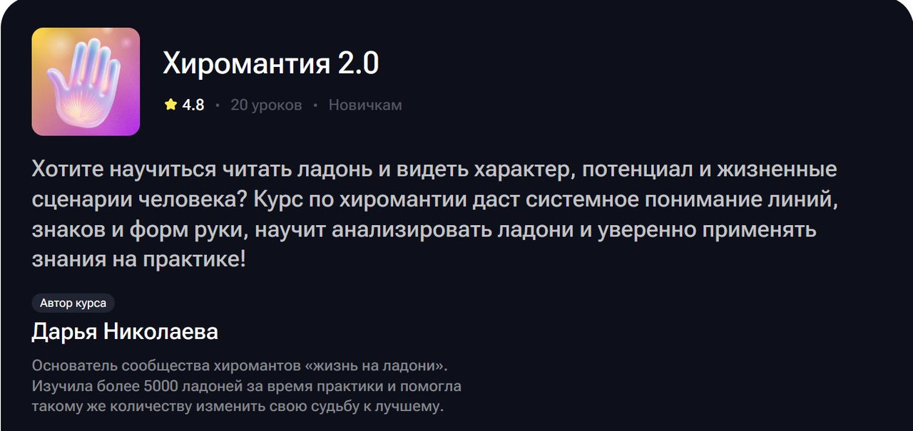 — Вы устали от поверхностных курсов в стиле "выучи три линии за выходные и стань хиромантом" (спойлер: так не работает, это как выучить три аккорда и назвать себя гитаристом)